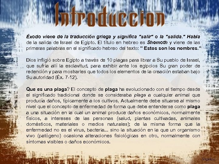 Éxodo viene de la traducción griega y significa "salir" o la "salida. " Habla de la salida de Israel de Egipto. El título en hebreo es Shemoth y viene de las primeras palabras en el significado hebreo del texto: " Estos son los nombres. " Dios infligió sobre Egipto a través de 10 plagas para librar a Su pueblo de Israel, que sufría allí la esclavitud, para exhibir ante los egipcios Su gran poder de redención y para mostrarles que todos los elementos de la creación estaban bajo Su autoridad (Éx. 7 -12). Que es una plaga? El concepto de plaga ha evolucionado con el tiempo desde el significado tradicional donde se consideraba plaga a cualquier animal que producía daños, típicamente a los cultivos. Actualmente debe situarse al mismo nivel que el concepto de enfermedad de forma que debe entenderse como plaga a una situación en la cual un animal produce daños económicos, normalmente físicos, a intereses de las personas (salud, plantas cultivadas, animales domésticos, materiales o medios naturales); de la misma forma que la enfermedad no es el virus, bacteria. . . sino la situación en la que un organismo vivo (patógeno) ocasiona alteraciones fisiológicas en otro, normalmente con síntomas visibles o daños económicos.