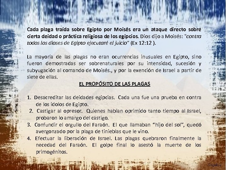 Cada plaga traída sobre Egipto por Moisés era un ataque directo sobre cierta deidad o práctica religiosa de los egipcios. Dios dijo a Moisés: "contra todos los dioses de Egipto ejecutaré el juicio" (Ex 12: 12 ). La mayoría de las plagas no eran ocurrencias inusuales en Egipto, sino fueron demostradas ser sobrenaturales por su intensidad, sucesión y subyugación al comando de Moisés. , y por la exención de Israel a partir de siete de ellas. EL PROPÓSITO DE LAS PLAGAS 1. Desacreditar las deidades egipcias. Cada una fue una prueba en contra de los ídolos de Egipto. 2. Castigar al opresor. Quienes habían oprimido tanto tiempo al Israel, probaron lo amargo del castigo. 3. Confundir el orgullo del Faraón. El que llamaban “hijo del sol”, quedó avergonzado por la plaga de tinieblas que le vino. 4. Efectuar la liberación de Israel. Las plagas quebraron finalmente la necedad del Faraón. El golpe final lo asestó la muerte de los primogénitos.