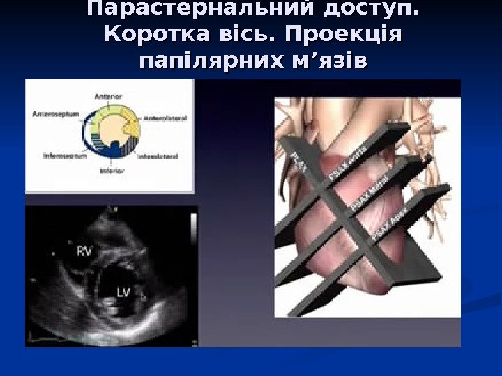 Парастернальний доступ. Коротка вісь. Змінюючи кут нахилу датчика до поверхні тіла пацієнта отримуємо три стандартні проекції серця за короткою віссю рівень аортального клапана та основи серця (п ‘‘ ятикамерна проекція) рівень мітрального клапана рівень папілярних мм ’’ язяз івів