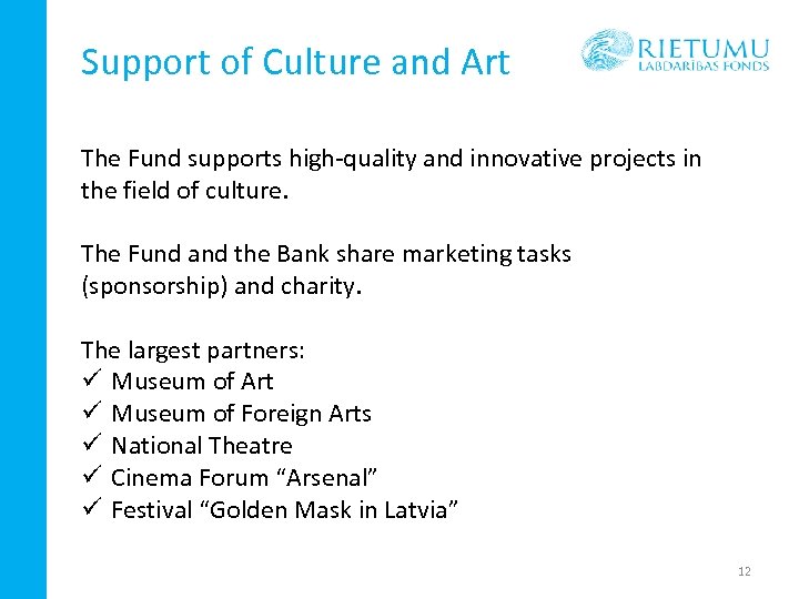 Urban Environment Development Rietumu Bank Fund has implemented several large projects jointly with municipalities of Riga and Jūrmala which allowed improving the environment in these cities. The largest projects: üChildren’s playground in Mežaparks (2008) – the largest and the most up-to-date playground in Riga üEquipping bicycle parking racks (2005 -2006) üExterior lighting system of St. Paul’s Church in Riga (2007) üStreet clock on Lāčplēša Street in Riga (2010) üStreet clock in Dzintari, Jūrmala (2007) üFountain in Majori, Jūrmala (2008). Main partners: Riga, Jūrmala, Latgale Urban District of Riga. 11