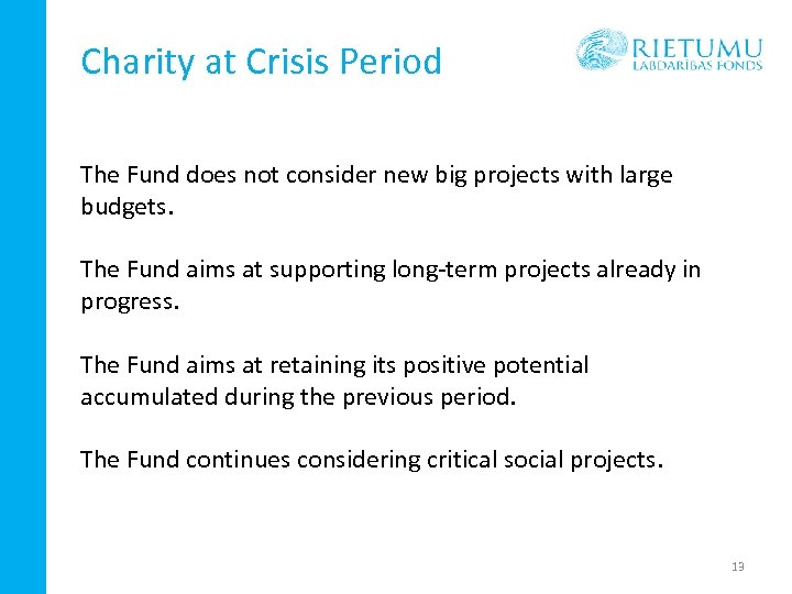 Charity at Crisis Period The Fund does not consider new big projects with large budgets. The Fund aims at supporting long-term projects already in progress. The Fund aims at retaining its positive potential accumulated during the previous period. The Fund continues considering critical social projects. 13