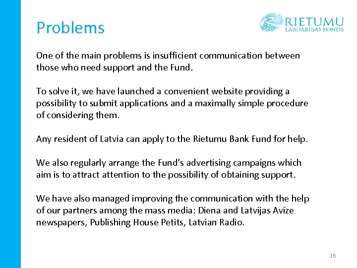 Problems One of the main problems is insufficient communication between those who need support and the Fund. To solve it, we have launched a convenient website providing a possibility to submit applications and a maximally simple procedure of considering them. Any resident of Latvia can apply to the Rietumu Bank Fund for help. We also regularly arrange the Fund’s advertising campaigns which aim is to attract attention to the possibility of obtaining support. We have also managed improving the communication with the help of our partners among the mass media: Diena and Latvijas Avīze newspapers, Publishing House Petits, Latvian Radio. 16