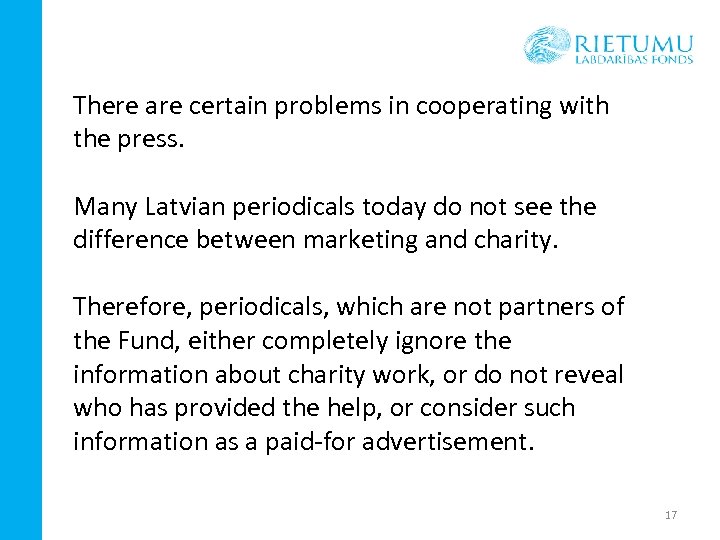 There are certain problems in cooperating with the press. Many Latvian periodicals today do not see the difference between marketing and charity. Therefore, periodicals, which are not partners of the Fund, either completely ignore the information about charity work, or do not reveal who has provided the help, or consider such information as a paid-for advertisement. 17