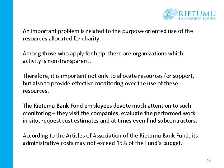 An important problem is related to the purpose-oriented use of the resources allocated for charity. Among those who apply for help, there are organizations which activity is non-transparent. Therefore, it is important not only to allocate resources for support, but also to provide effective monitoring over the use of these resources. The Rietumu Bank Fund employees devote much attention to such monitoring – they visit the companies, evaluate the performed work in-situ, request cost estimates and at times even find subcontractors. According to the Articles of Association of the Rietumu Bank Fund, its administrative costs may not exceed 15% of the Fund’s budget. 18