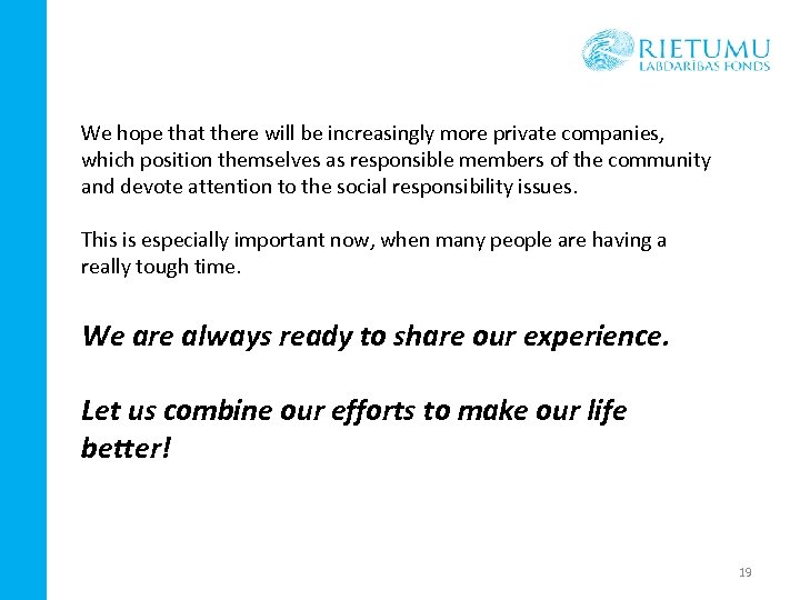We hope that there will be increasingly more private companies, which position themselves as responsible members of the community and devote attention to the social responsibility issues. This is especially important now, when many people are having a really tough time. We are always ready to share our experience. Let us combine our efforts to make our life better! 19