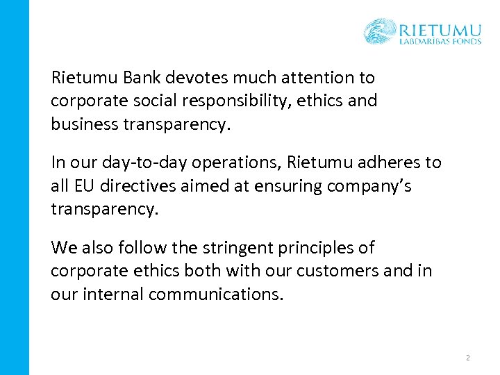 Rietumu Bank devotes much attention to corporate social responsibility, ethics and business transparency. In our day-to-day operations, Rietumu adheres to all EU directives aimed at ensuring company’s transparency. We also follow the stringent principles of corporate ethics both with our customers and in our internal communications. 2