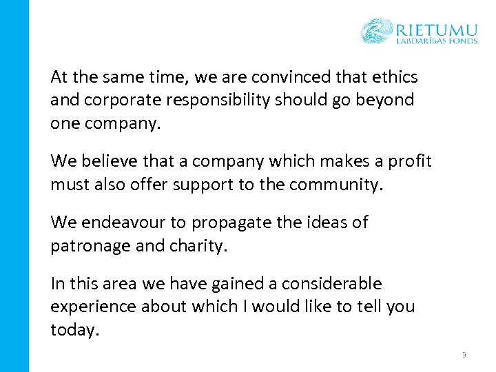 At the same time, we are convinced that ethics and corporate responsibility should go beyond one company. We believe that a company which makes a profit must also offer support to the community. We endeavour to propagate the ideas of patronage and charity. In this area we have gained a considerable experience about which I would like to tell you today. 3
