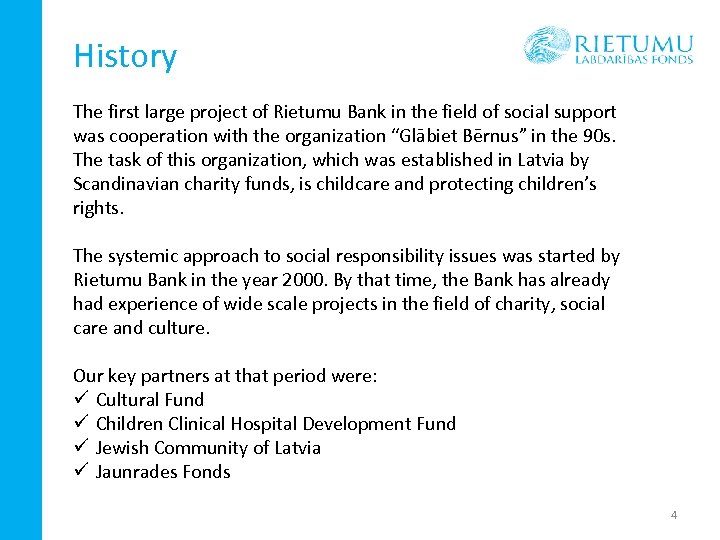 History The first large project of Rietumu Bank in the field of social support was cooperation with the organization “Glābiet Bērnus” in the 90 s. The task of this organization, which was established in Latvia by Scandinavian charity funds, is childcare and protecting children’s rights. The systemic approach to social responsibility issues was started by Rietumu Bank in the year 2000. By that time, the Bank has already had experience of wide scale projects in the field of charity, social care and culture. Our key partners at that period were: ü Cultural Fund ü Children Clinical Hospital Development Fund ü Jewish Community of Latvia ü Jaunrades Fonds 4