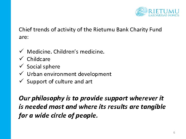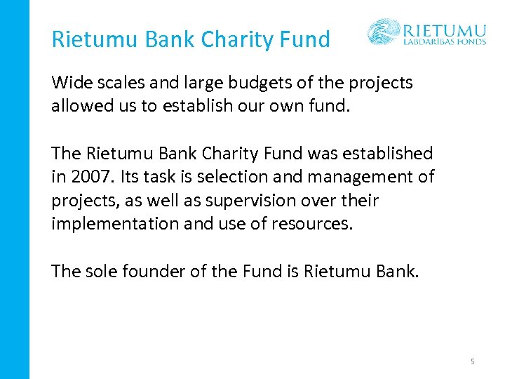Rietumu Bank Charity Fund Wide scales and large budgets of the projects allowed us to establish our own fund. The Rietumu Bank Charity Fund was established in 2007. Its task is selection and management of projects, as well as supervision over their implementation and use of resources. The sole founder of the Fund is Rietumu Bank. 5