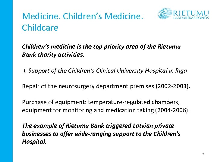 Medicine. Children’s Medicine. Childcare Children’s medicine is the top priority area of the Rietumu Bank charity activities. I. Support of the Children’s Clinical University Hospital in Riga Repair of the neurosurgery department premises (2002 -2003). Purchase of equipment: temperature-regulated chambers, equipment for monitoring and medication taking (2004 -2006). The example of Rietumu Bank triggered Latvian private businesses to offer wide-ranging support to the Children’s Hospital. 7