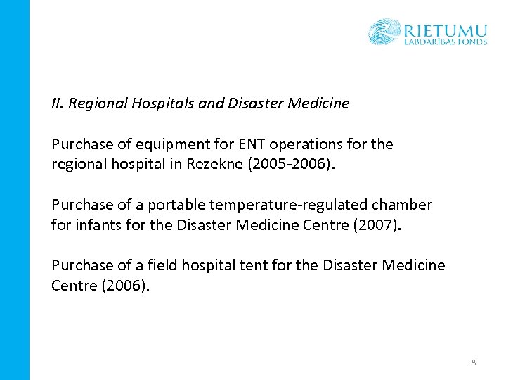 II. Regional Hospitals and Disaster Medicine Purchase of equipment for ENT operations for the regional hospital in Rezekne (2005 -2006). Purchase of a portable temperature-regulated chamber for infants for the Disaster Medicine Centre (2007). Purchase of a field hospital tent for the Disaster Medicine Centre (2006). 8