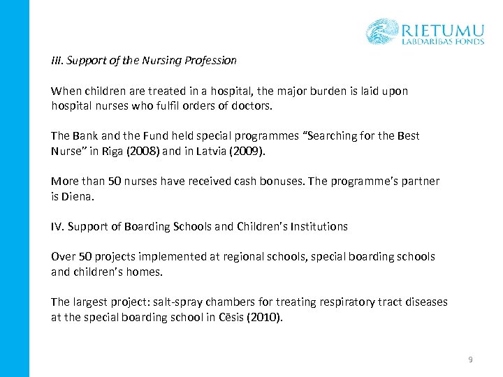 III. Support of the Nursing Profession When children are treated in a hospital, the major burden is laid upon hospital nurses who fulfil orders of doctors. The Bank and the Fund held special programmes “Searching for the Best Nurse” in Riga (2008) and in Latvia (2009). More than 50 nurses have received cash bonuses. The programme’s partner is Diena. IV. Support of Boarding Schools and Children’s Institutions Over 50 projects implemented at regional schools, special boarding schools and children’s homes. The largest project: salt-spray chambers for treating respiratory tract diseases at the special boarding school in Cēsis (2010). 9