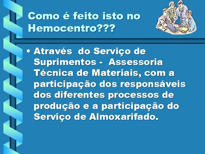 Como é feito isto no Hemocentro? ? ? • Através do Serviço de Suprimentos - Assessoria Técnica de Materiais, com a participação dos responsáveis dos diferentes processos de produção e a participação do Serviço de Almoxarifado.