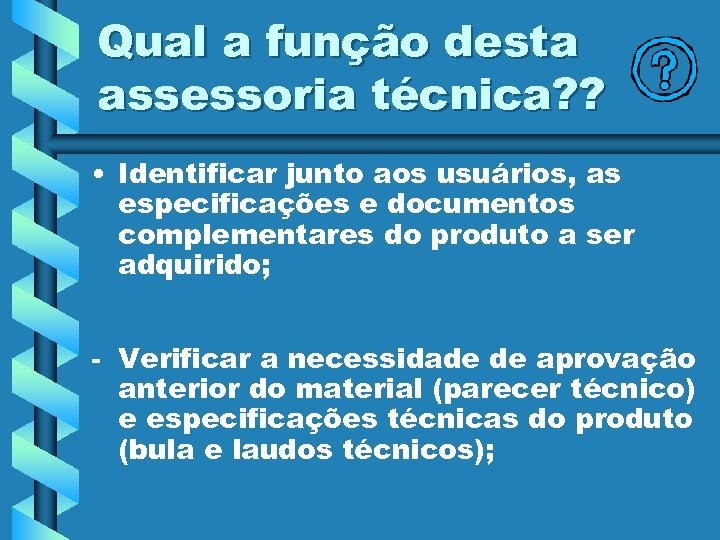 Qual a função desta assessoria técnica? ? • Identificar junto aos usuários, as especificações e documentos complementares do produto a ser adquirido; - Verificar a necessidade de aprovação anterior do material (parecer técnico) e especificações técnicas do produto (bula e laudos técnicos);