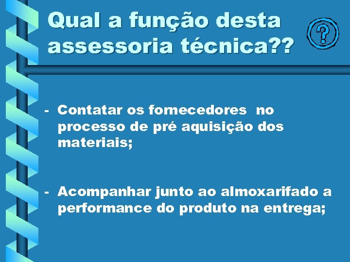 Qual a função desta assessoria técnica? ? - Contatar os fornecedores no processo de pré aquisição dos materiais; - Acompanhar junto ao almoxarifado a performance do produto na entrega;