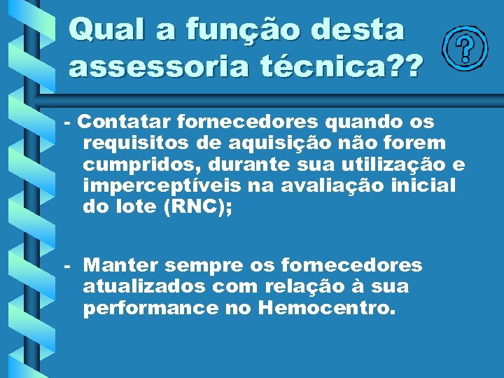 Qual a função desta assessoria técnica? ? - Contatar fornecedores quando os requisitos de aquisição não forem cumpridos, durante sua utilização e imperceptíveis na avaliação inicial do lote (RNC); - Manter sempre os fornecedores atualizados com relação à sua performance no Hemocentro.