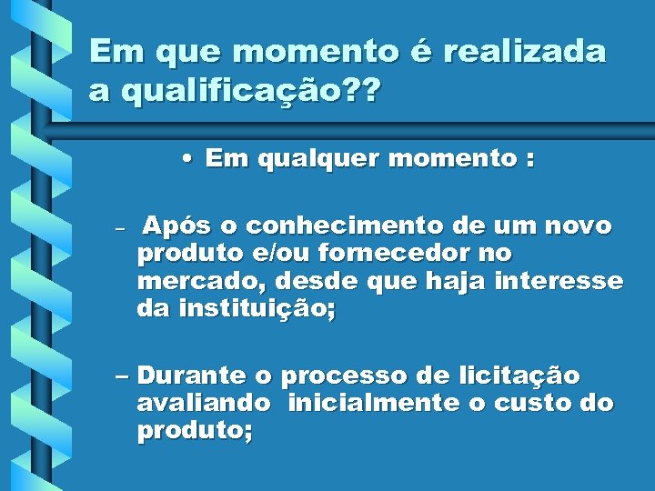 Em que momento é realizada a qualificação? ? • Em qualquer momento : – Após o conhecimento de um novo produto e/ou fornecedor no mercado, desde que haja interesse da instituição; – Durante o processo de licitação avaliando inicialmente o custo do produto;