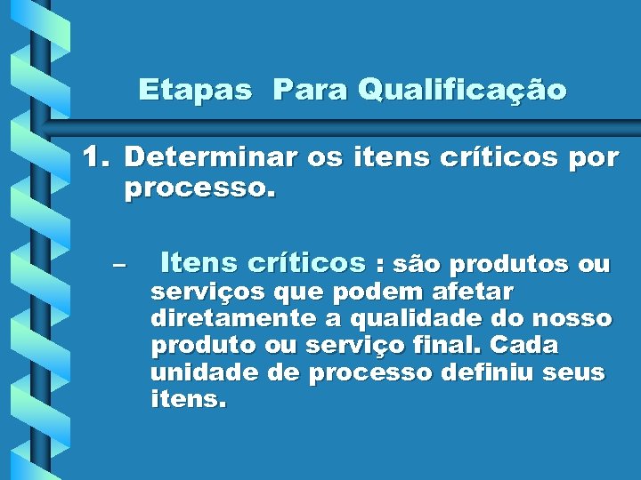 Etapas Para Qualificação 1. Determinar os itens críticos por processo. – Itens críticos : são produtos ou serviços que podem afetar diretamente a qualidade do nosso produto ou serviço final. Cada unidade de processo definiu seus itens.