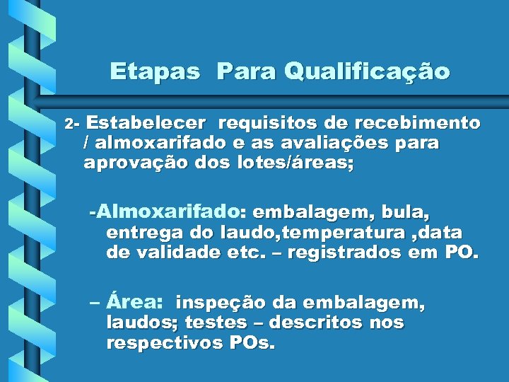 Etapas Para Qualificação 2 - Estabelecer requisitos de recebimento / almoxarifado e as avaliações para aprovação dos lotes/áreas; -Almoxarifado: embalagem, bula, entrega do laudo, temperatura , data de validade etc. – registrados em PO. – Área: inspeção da embalagem, laudos; testes – descritos nos respectivos POs.