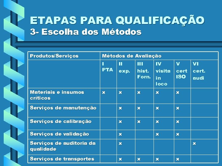 ETAPAS PARA QUALIFICAÇÃO 3 - Escolha dos Métodos Produtos/Serviços Métodos de Avaliação I PTA II exp. III IV hist. visita Forn. in loco V cert ISO x x x Serviços de manutenção x x Serviços de calibração x x Serviços de validação x x x Serviços de auditoria da qualidade x Serviços de transportes x Materiais e insumos críticos VI cert. audi x x