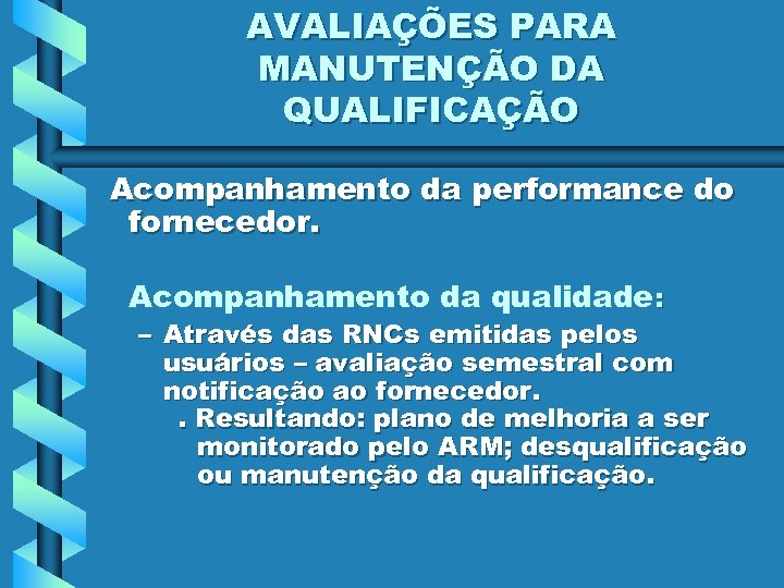 AVALIAÇÕES PARA MANUTENÇÃO DA QUALIFICAÇÃO Acompanhamento da performance do fornecedor. Acompanhamento da qualidade: – Através das RNCs emitidas pelos usuários – avaliação semestral com notificação ao fornecedor. . Resultando: plano de melhoria a ser monitorado pelo ARM; desqualificação ou manutenção da qualificação.
