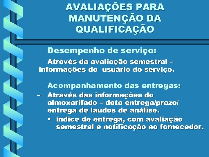 AVALIAÇÕES PARA MANUTENÇÃO DA QUALIFICAÇÃO Desempenho de serviço: Através da avaliação semestral – informações do usuário do serviço. Acompanhamento das entregas: – Através das informações do almoxarifado – data entrega/prazo/ entrega de laudos de análise. • índice de entrega, com avaliação semestral e notificação ao fornecedor.