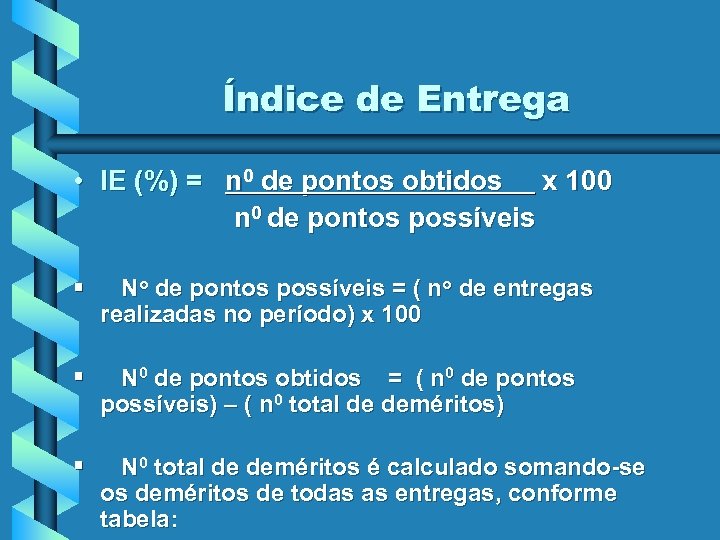 Índice de Entrega • IE (%) = n 0 de pontos obtidos x 100 n 0 de pontos possíveis § No de pontos possíveis = ( no de entregas realizadas no período) x 100 § N 0 de pontos obtidos = ( n 0 de pontos possíveis) – ( n 0 total de deméritos) § N 0 total de deméritos é calculado somando-se os deméritos de todas as entregas, conforme tabela: