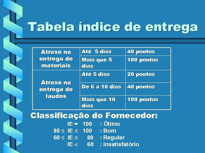 Tabela índice de entrega Atraso na entrega de materiais 40 pontos Mais que 5 dias 100 pontos Até 5 dias Atraso na entrega de laudos Até 5 dias 20 pontos De 6 a 10 dias 40 pontos Mais que 10 dias 100 pontos Classificação do Fornecedor: IE = 100 80 IE 100 60 IE 80 IE 60 : Ótimo : Bom : Regular : insatisfatório