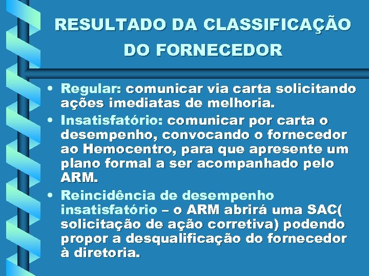 RESULTADO DA CLASSIFICAÇÃO DO FORNECEDOR • Regular: comunicar via carta solicitando ações imediatas de melhoria. • Insatisfatório: comunicar por carta o desempenho, convocando o fornecedor ao Hemocentro, para que apresente um plano formal a ser acompanhado pelo ARM. • Reincidência de desempenho insatisfatório – o ARM abrirá uma SAC( solicitação de ação corretiva) podendo propor a desqualificação do fornecedor à diretoria.