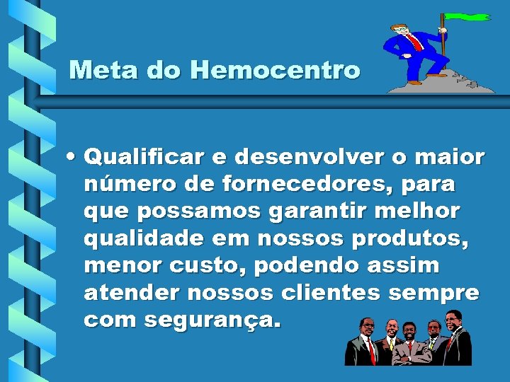 Meta do Hemocentro • Qualificar e desenvolver o maior número de fornecedores, para que possamos garantir melhor qualidade em nossos produtos, menor custo, podendo assim atender nossos clientes sempre com segurança.