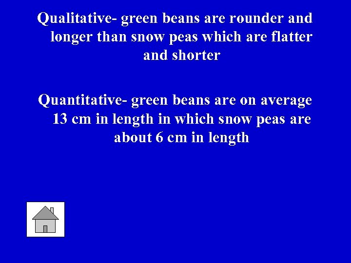 Qualitative- green beans are rounder and longer than snow peas which are flatter and shorter Quantitative- green beans are on average 13 cm in length in which snow peas are about 6 cm in length