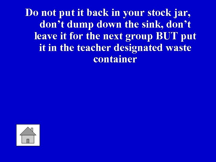 Do not put it back in your stock jar, don’t dump down the sink, don’t leave it for the next group BUT put it in the teacher designated waste container