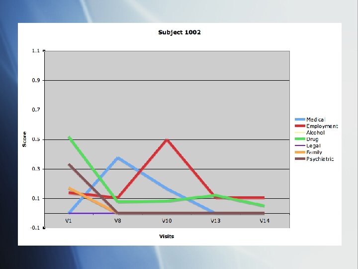 Subject 1002 § 54 yr old male § Problem substance: Heroin 2. 5/g/day § Has achieved complete abstinence, currently at V 15