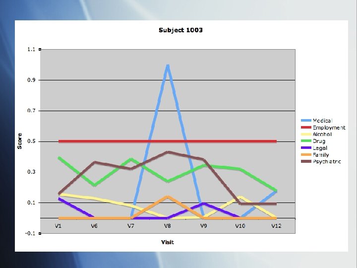 Subject 1003 § 25 yr old female § Problem substance: binge heroin use, prescribed methadone 20 mg/day, self prescribed hydrocodone 20 -300 mg/day, oxycodone 240 mg/day § M 1/V 6 reported relapse at 40 mg oxy/day § Increased opiate use, began methadone again