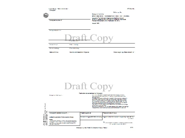 Transport Documents • Mate’s receipt. • Charter Party SEA/OCEAN • Maritime Bill of Lading, B/L • Air Consignment note or Airway Bill • Charter Party AIR • Railway consignment note or Railway Bill • Road consignment note or Road waybill • Combined Transport Document: Multimodal Bill of Lading LAND COMBINATION