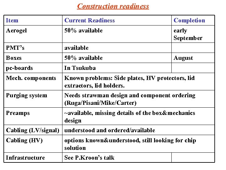 Construction readiness Item Current Readiness Completion Aerogel 50% available early September PMT’s available Boxes 50% available pc-boards In Tsukuba Mech. components Known problems: Side plates, HV protectors, lid extractors, lid holders. Purging system Needs strawman design and component ordering (Ruga/Pisani/Mike/Carter) Preamps ~available, missing details of the box&mechanics design August Cabling (LV/signal) understood and ordered/available Cabling (HV) options known&understood, still looking for chip solution Infrastructure See P. Kroon’s talk