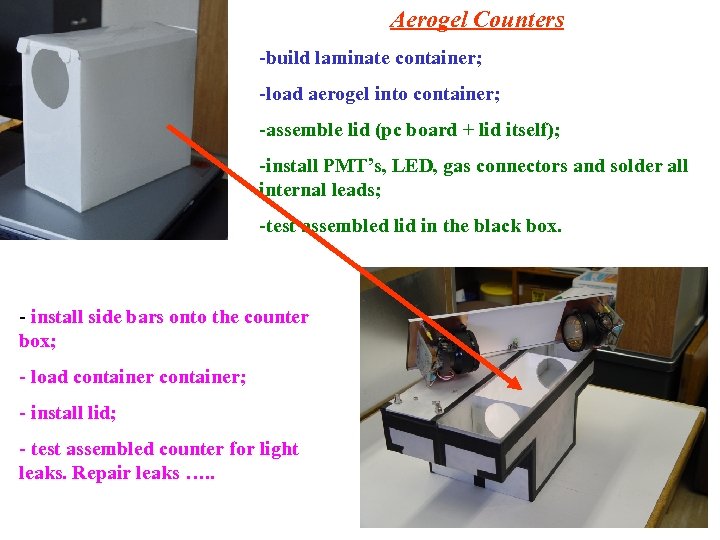 Aerogel Counters -build laminate container; -load aerogel into container; -assemble lid (pc board + lid itself); -install PMT’s, LED, gas connectors and solder all internal leads; -test assembled lid in the black box. - install side bars onto the counter box; - load container; - install lid; - test assembled counter for light leaks. Repair leaks …. .