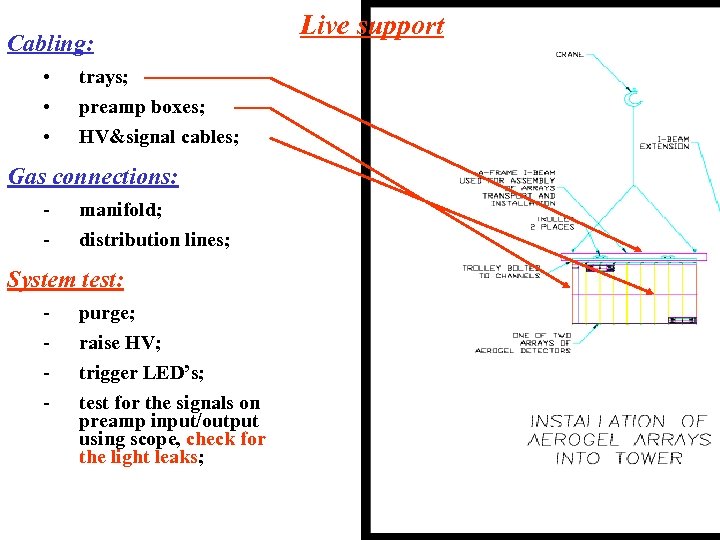 Cabling: • • • trays; preamp boxes; HV&signal cables; Gas connections: - manifold; distribution lines; System test: - purge; raise HV; trigger LED’s; test for the signals on preamp input/output using scope, check for the light leaks; Live support