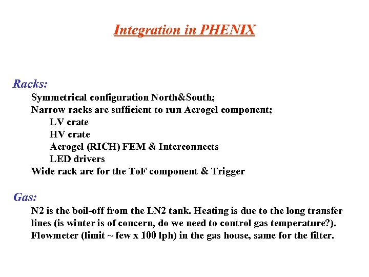Integration in PHENIX Racks: Symmetrical configuration North&South; Narrow racks are sufficient to run Aerogel component; LV crate HV crate Aerogel (RICH) FEM & Interconnects LED drivers Wide rack are for the To. F component & Trigger Gas: N 2 is the boil-off from the LN 2 tank. Heating is due to the long transfer lines (is winter is of concern, do we need to control gas temperature? ). Flowmeter (limit ~ few x 100 lph) in the gas house, same for the filter.