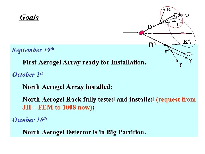K- Goals D+ September 19 th First Aerogel Array ready for Installation. _ D 0 p+ u e+ K+ po pg g October 1 st North Aerogel Array installed; North Aerogel Rack fully tested and installed (request from JH – FEM to 1008 now); October 10 th North Aerogel Detector is in Big Partition.