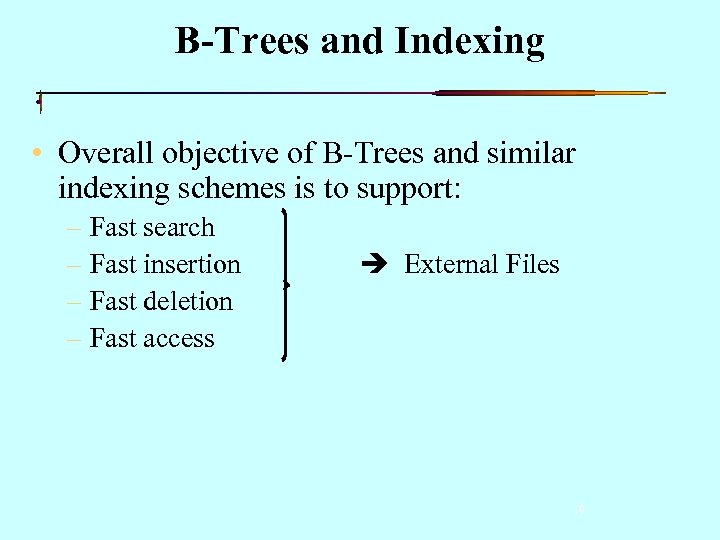 B-Trees and Indexing • Overall objective of B-Trees and similar indexing schemes is to support: – Fast search – Fast insertion – Fast deletion – Fast access External Files 10