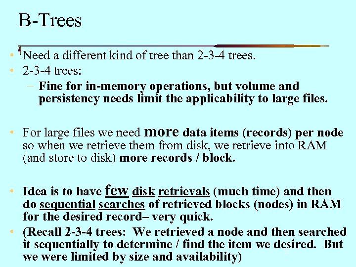 B-Trees • Need a different kind of tree than 2 -3 -4 trees. • 2 -3 -4 trees: – Fine for in-memory operations, but volume and persistency needs limit the applicability to large files. • For large files we need more data items (records) per node so when we retrieve them from disk, we retrieve into RAM (and store to disk) more records / block. • Idea is to have few disk retrievals (much time) and then do sequential searches of retrieved blocks (nodes) in RAM for the desired record– very quick. • (Recall 2 -3 -4 trees: We retrieved a node and then searched it sequentially to determine / find the item we desired. But 11 we were limited by size and availability)