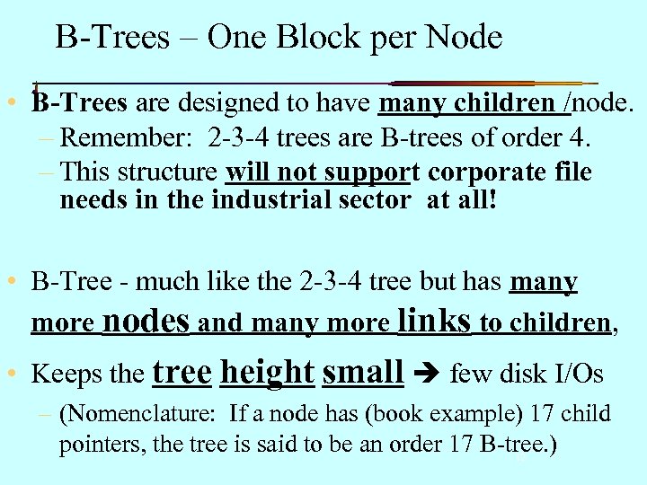 B-Trees – One Block per Node • B-Trees are designed to have many children /node. – Remember: 2 -3 -4 trees are B-trees of order 4. – This structure will not support corporate file needs in the industrial sector at all! • B-Tree - much like the 2 -3 -4 tree but has many more nodes and many more links to children, • Keeps the tree height small few disk I/Os – (Nomenclature: If a node has (book example) 17 child pointers, the tree is said to be an order 17 B-tree. ) 12