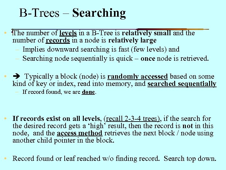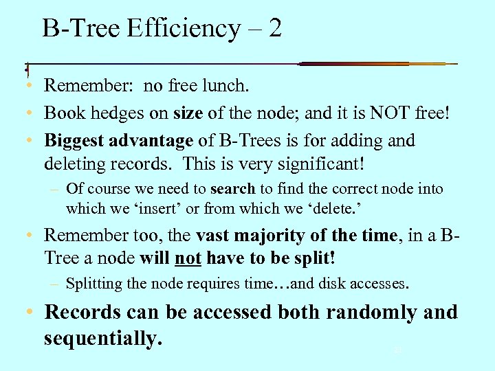 B-Tree Efficiency – 2 • Remember: no free lunch. • Book hedges on size of the node; and it is NOT free! • Biggest advantage of B-Trees is for adding and deleting records. This is very significant! – Of course we need to search to find the correct node into which we ‘insert’ or from which we ‘delete. ’ • Remember too, the vast majority of the time, in a BTree a node will not have to be split! – Splitting the node requires time…and disk accesses. • Records can be accessed both randomly and sequentially. 21