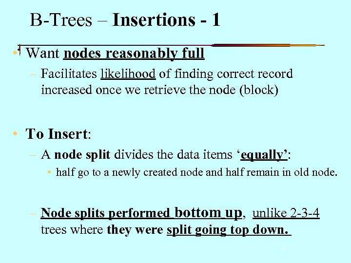 B-Trees – Insertions - 1 • Want nodes reasonably full – Facilitates likelihood of finding correct record increased once we retrieve the node (block) • To Insert: – A node split divides the data items ‘equally’: • half go to a newly created node and half remain in old node. – Node splits performed bottom up, unlike 2 -3 -4 trees where they were split going top down. 14