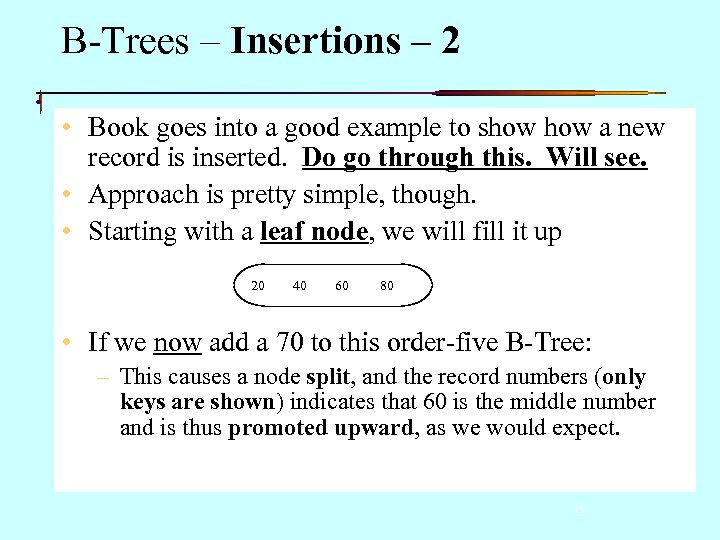B-Trees – Insertions – 2 • Book goes into a good example to show a new record is inserted. Do go through this. Will see. • Approach is pretty simple, though. • Starting with a leaf node, we will fill it up 20 40 60 80 • If we now add a 70 to this order-five B-Tree: – This causes a node split, and the record numbers (only keys are shown) indicates that 60 is the middle number and is thus promoted upward, as we would expect. 15