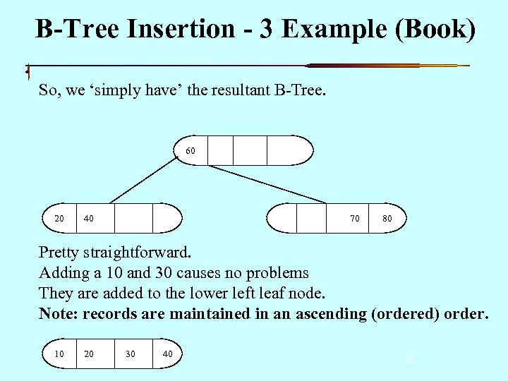 B-Tree Insertion - 3 Example (Book) So, we ‘simply have’ the resultant B-Tree. 60 20 40 70 80 Pretty straightforward. Adding a 10 and 30 causes no problems They are added to the lower left leaf node. Note: records are maintained in an ascending (ordered) order. 10 20 30 40 16