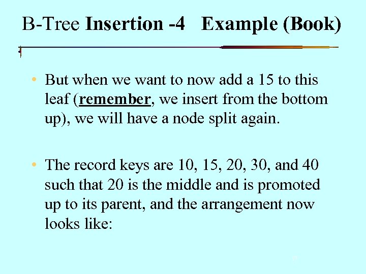 B-Tree Insertion -4 Example (Book) • But when we want to now add a 15 to this leaf (remember, we insert from the bottom up), we will have a node split again. • The record keys are 10, 15, 20, 30, and 40 such that 20 is the middle and is promoted up to its parent, and the arrangement now looks like: 17
