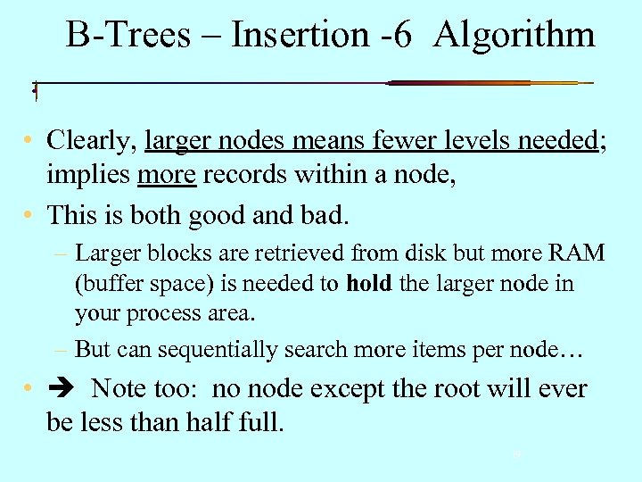 B-Trees – Insertion -6 Algorithm • Clearly, larger nodes means fewer levels needed; implies more records within a node, • This is both good and bad. – Larger blocks are retrieved from disk but more RAM (buffer space) is needed to hold the larger node in your process area. – But can sequentially search more items per node… • Note too: no node except the root will ever be less than half full. 19