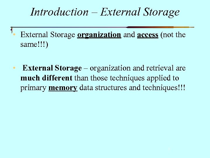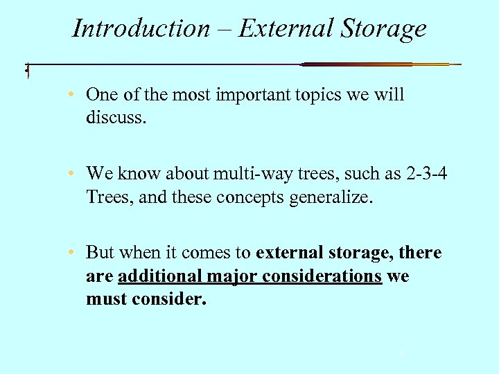 Introduction – External Storage • One of the most important topics we will discuss. • We know about multi-way trees, such as 2 -3 -4 Trees, and these concepts generalize. • But when it comes to external storage, there additional major considerations we must consider. 2